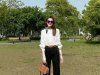 薄荷綠休閒針織,疊穿白色內搭和深灰色西裝長褲。清新的薄荷綠搭配上深灰色長褲,既體現出素雅靈氣的特徵,又不失端莊和現代感,好評。