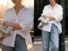 比如像下面這位達人,選擇的是淺綠色的襯衫,上一條白色的闊腿西褲,精緻又幹練,或者你也可以選擇一件粉色的襯衫來搭配,讓你少女感直接爆棚,這樣的穿衣配色如果出門旅遊,遇到花花草草的地方拍照很出片。