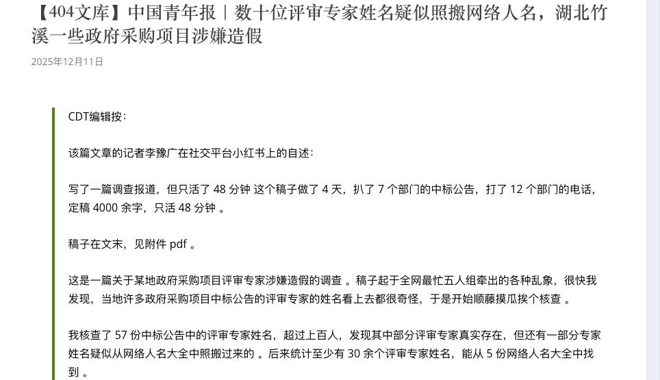 中青網12月11日發佈一篇調查報導,核查地方政府57份中標文件。該文上線48分鐘後被撤下,中國數字時代隨即對全文進行存檔。調查記者李豫廣在小紅書表示,這篇稿件歷時4天完成,核查7個部門的中標公告、致電12個部門,定稿4000餘字,但發佈僅48分鐘即下線。