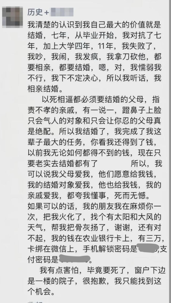 信中,她稱自己與家人因為婚姻問題「對抗」了7年,她不斷反抗、爭吵、發瘋,甚至以極端方式拒絕相親與婚姻,但最終還是失敗了。