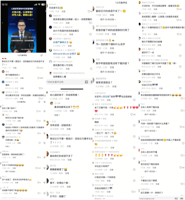很多評論諷刺軍方上述言論都是針對大陸人抖威風,而日本政府根本沒機會看到:「給想看的人看」「收到,立馬通知日方下載抖音!」「高市早苗到底有沒有下載抖音?」「發給家裏人看啊,讓家裏人知道我多威武!」「乾脆自己拉個群吧!」「要不你倆拉個群?」