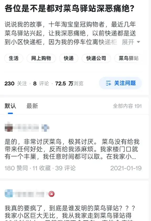 在黑貓投訴平台上,關於「快遞」的投訴有120多萬條,其中關於驛站的投訴佔據了半壁江山;在知乎上,網友的吐槽更是直抒胸臆,一點面子不留。