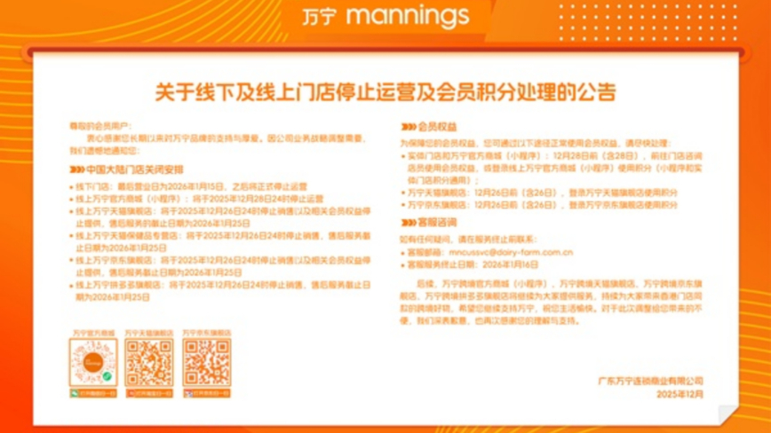 公告顯示,其線下門店最後營業日為2026年1月15日,之後將正式停止運營;線上萬寧官方商城(小程序)將於2025年12月28日24時停止運營,而天貓旗艦店、京東旗艦店、天貓保健品專營店則將在12月26日停止運營。
