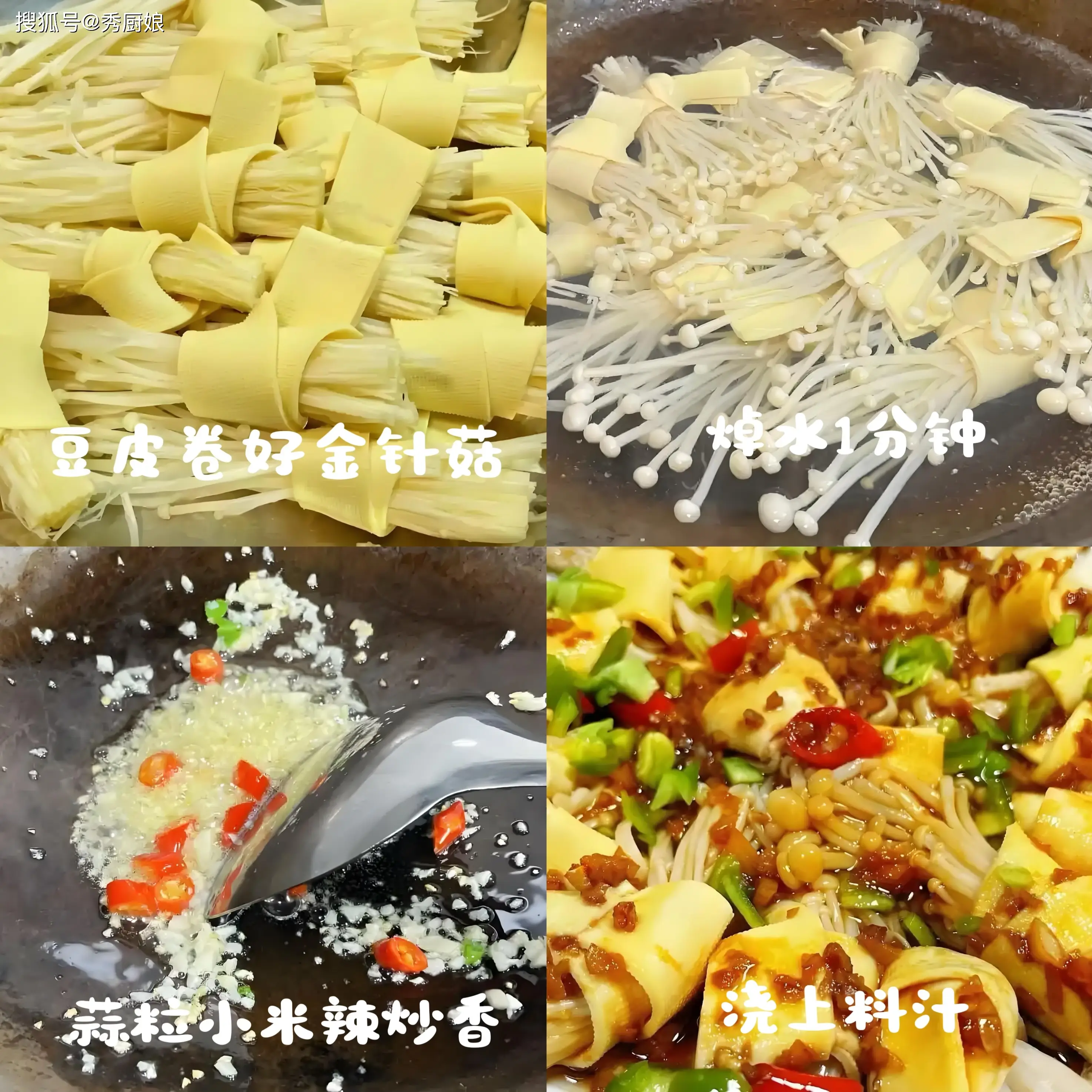 1.豆皮切成長方形小片,放上一小撮金針菇,捲起來,中間用一根金針菇紮緊打結。