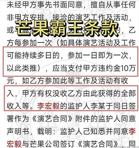 陸媒報導,李宏毅16歲未成年時,2014年監護人與芒果娛樂簽了八年長約。他於2017年發函與公司解約,指公司沒給資源還拖欠報酬。隨後芒果娛樂起訴索賠,2019年法院判李宏毅支付200萬元違約金並履約至2022年。
