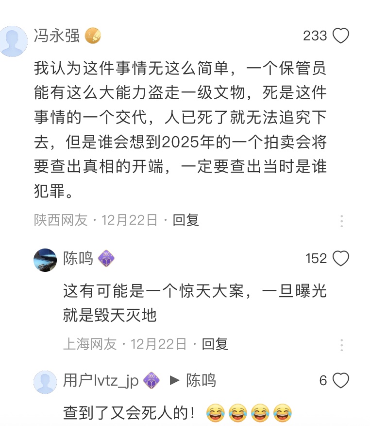 對於這一判決,網友質疑說,「一個23歲的保管員,如何能獨自完成19件文物的盜竊、銷贓?他的上級在哪?監管在哪?入庫清點制度在哪?」