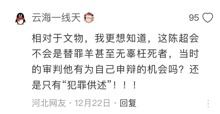 「相對於文物,我更想知道,這陳超會不會是替罪羊甚至無辜枉死者,當時的審判他有為自己申辯的機會嗎?還是只有『犯罪供述』。」