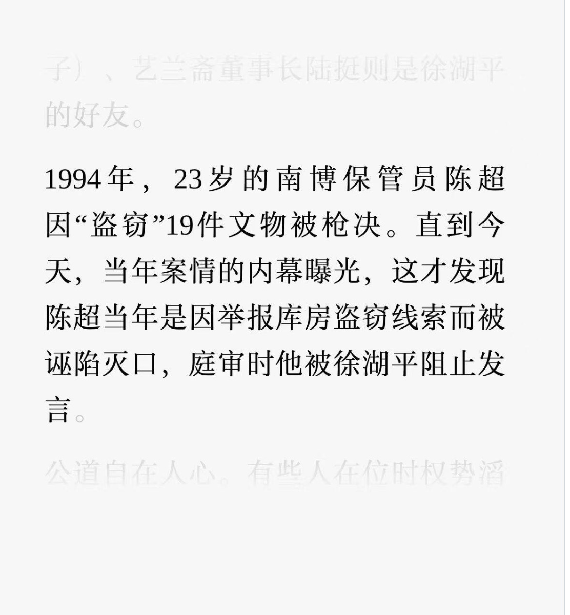 近日,南博退休員工郭禮典透過視頻公開舉報前院長徐湖平。舉報內容披露了極具爭議的庭審細節:陳超在審判期間曾試圖「立功贖罪」,準備舉報庫房內更深層的文物偷盜線索。