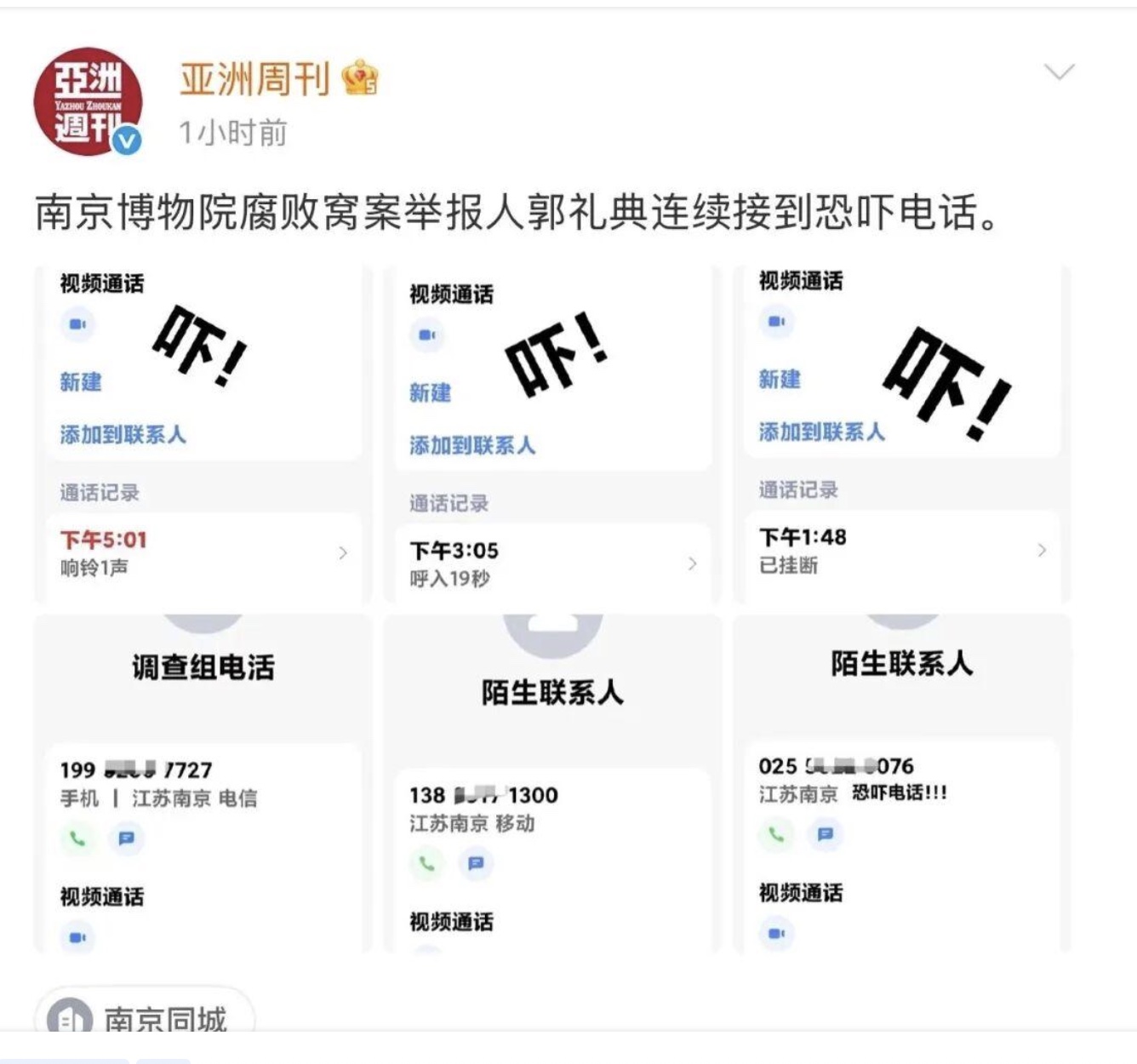 12月24日,據亞洲周刊報導,實名舉報徐湖平的南京博物院前員工郭禮典,收到多個恐嚇電話!這些電話大多數IP都是江蘇南京,還有江蘇鎮江、甘肅蘭州的等,電話的內容基本是警告他「不要亂說話」。