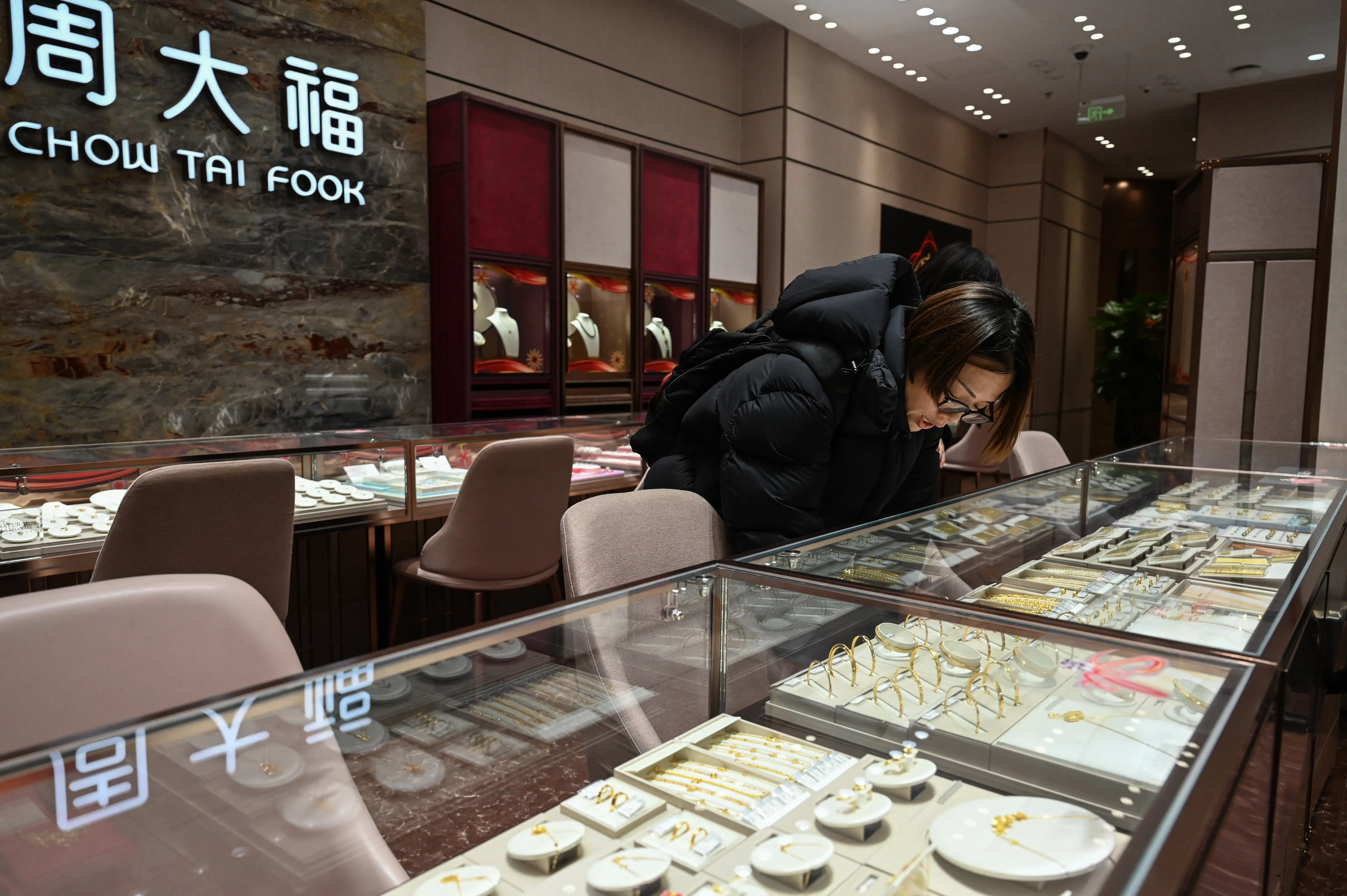 示意圖。圖為2024年2月5日,北京一家周大福珠寶店內的一名顧客在瀏覽黃金首飾。(Jade Gao/AFP via Getty Images)