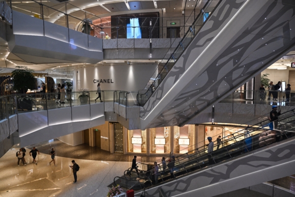 圖為2024年6月5日,人們在上海陸家嘴金融區的一家購物中心購物。(Hector Retamal/AFP via Getty Images)
