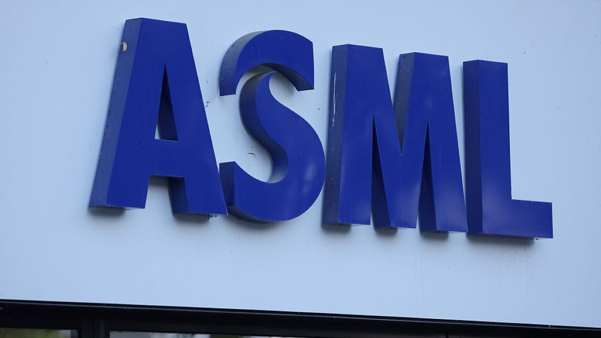 圖為荷蘭半導體巨頭ASML公司在德國柏林一棟辦公大樓上懸掛的公司標誌。(Sean Gallup/Getty Images)