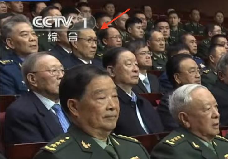 中共國防部部長董軍這次在慰問現場僅站在退休老官員中間。在觀看演出時,董軍的位置坐在後面第三排。