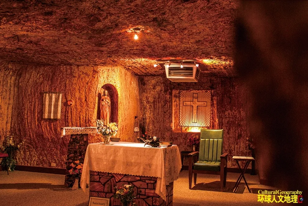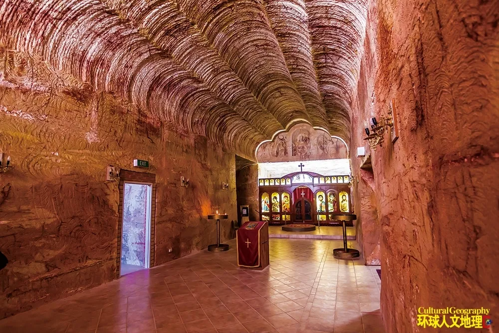 當人們把生活帶入地下,也自然將各自的信仰與文化一同攜入庫伯佩地的深處。這個獨特的地下社區,自誕生之初便匯聚着一群來自不同地域的冒險者——從最早的希臘等地的移民,到如今的商人、藝術家與避世者,幾十個不同民族的居民在此共同勾勒出複雜多元的文化圖譜。根據澳大利亞近年來的一份地區報告,小鎮居民擁有來自51個國家背景。這種多元性,尤其體現在當地宗教建築中:塞爾維亞東正教教堂有着花瓣狀的穹頂,砂岩牆上飾有精美的聖徒雕刻,彩色的人物花窗投下光影;聖彼得和保羅天主教堂小巧精緻,內部擺放着整齊的紅色座椅;聖公會地下墓穴教堂則極為樸素,由樹枝拼就的十字架兩側的牆面上,僅有兩隻簡單雕刻的耶穌魚圖案在傳達着虔誠與寧靜。