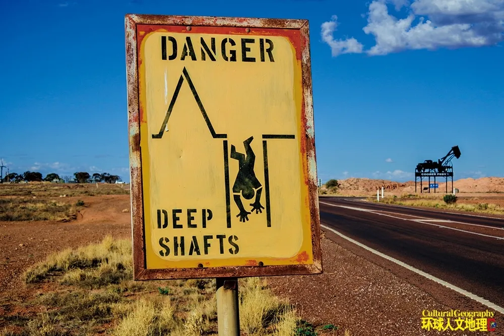 持續百年的採礦活動,不僅書寫着庫伯佩地的歷史,還改變了這裏的地表景觀。無數白色礦渣堆如巨型蟻丘,與鎮中心最高的金屬樹一同矗立在紅土平原。「大絞車」矗立山頂,既是俯瞰小鎮的絕佳觀景台,更是採礦業的精神圖騰。隨處可見的礦井入口、影院「禁止攜帶炸藥」的標識,都在提醒着外來者這裏獨特的產業背景。鎮上的商店展示着蛋白石從切割、拋光到鑲嵌的全過程,最終成為遊客手中的精美飾品。為豐富旅遊體驗,小鎮還設立了公共「撈麵條」區,遊客可以親手在廢棄礦渣中翻找,偶有幸運者真能撿到被遺漏的細小寶石,引得一陣驚喜的歡呼。