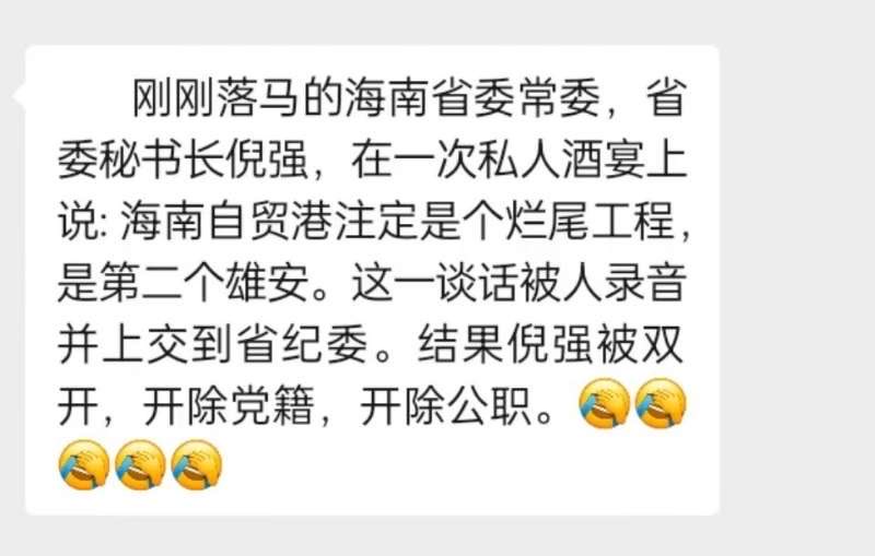 近日,網上傳出消息稱,倪強因酒後吐真言,稱海南自貿港會註定是一個爛尾工程,是第二個雄安。不想這段談話被人偷錄了上交到省紀委,倪強因此被雙開。