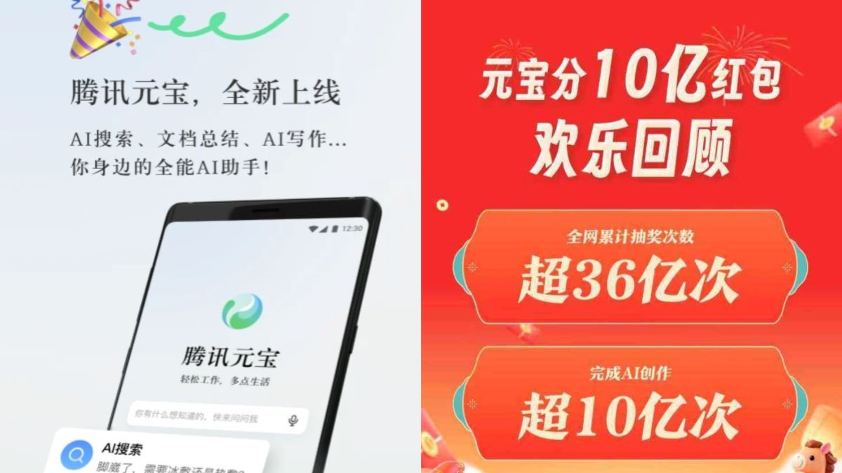 騰訊推出的AI應用「元寶」上線的廣告及2026年2月的10億元紅包活動。(網頁截圖合成)