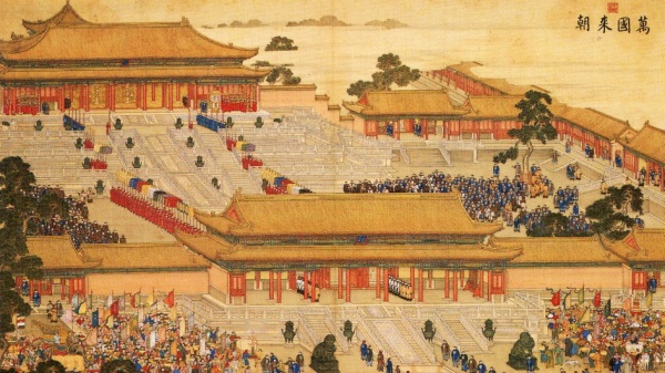 清代乾隆《萬國來朝圖》局部,前為太和門,後為太和殿。(圖片來源:公用領域)
