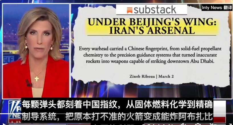 2026年3月3日,彼得·施韋澤(Peter Schweizer),這位寫過《當場抓獲:中共如何滲透美國精英並操控全球》(Red-Handed: How American Elites Get Rich Helping China Win)等書的美國保守派調查記者,在福克斯新聞《Ingraham Angle》節目裏直戳痛點:每枚伊朗導彈上都有中國指紋。