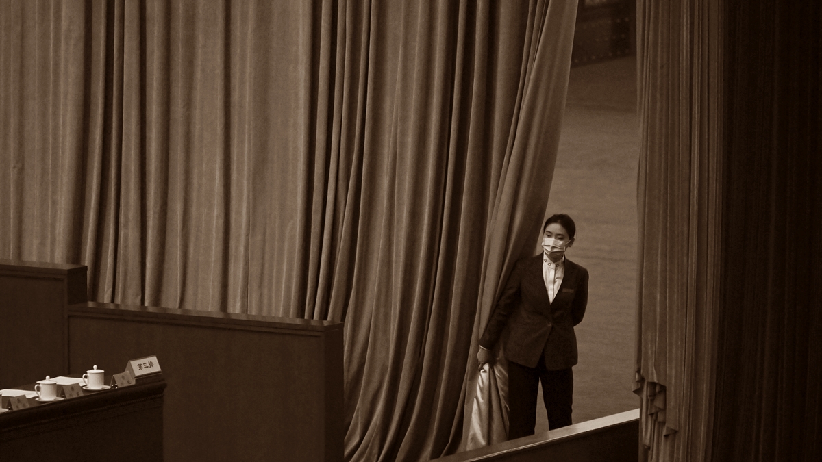 2024年3月10日,一名工作人員在北京人民大會堂為政協會議閉幕式做準備。