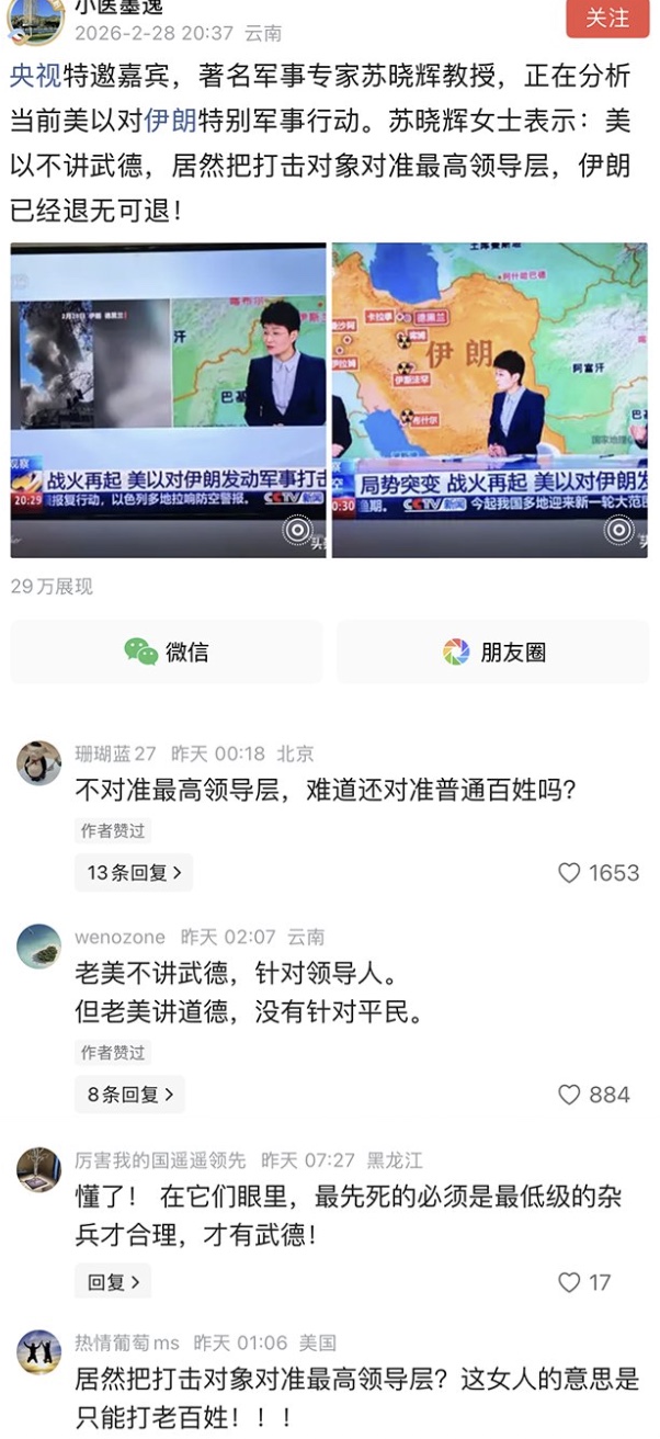 此言一出,立即引發網友諷刺:「不對準最高領導層,難道還對準普通百姓嗎?」「那問她應該先打誰?」「中國專家一講話就原形畢露,完全是媚上欺下,打最高領導是不講武德,那殺無辜百姓就是理所當然嗎?」「美國不講武德,但它不殺平民,講道德!」、「應該對準磚家」、「不禍害老百姓,才是最高武德」。
