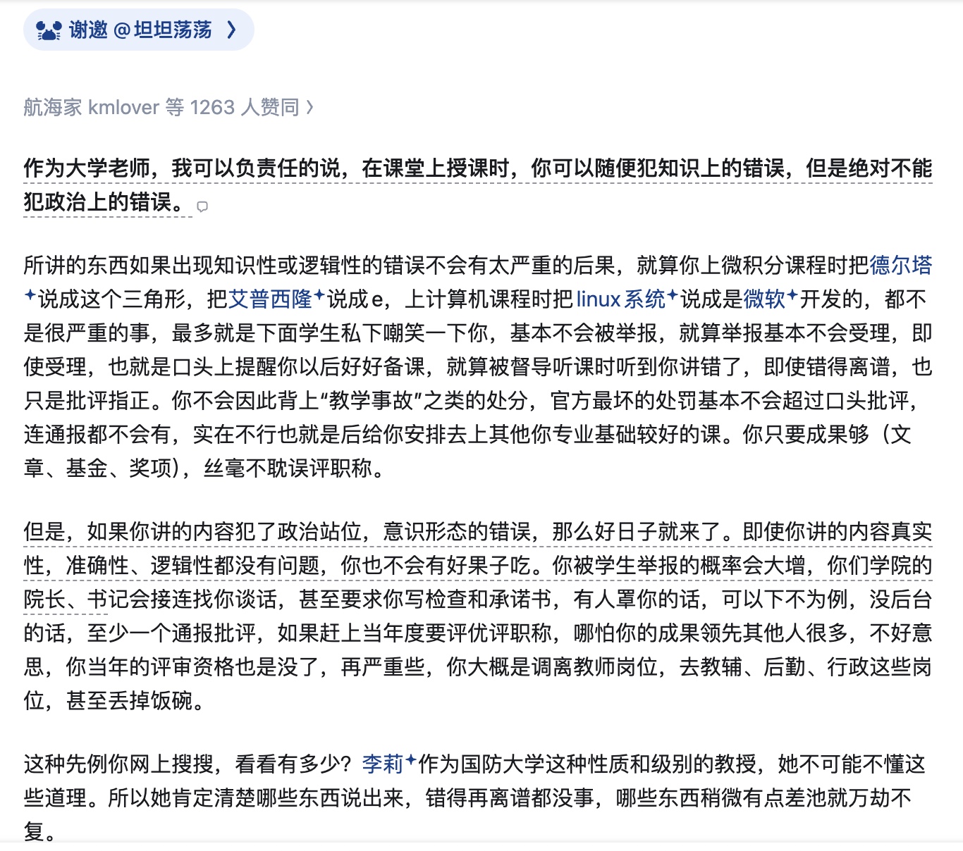 該網友指出,身為大學老師,在課堂上犯知識性錯誤最多被學生私下嘲笑,不會有嚴重後果;但若觸犯「政治站位」或意識形態的錯誤,即便內容再真實準確,也會面臨舉報、約談、寫檢討,甚至丟掉飯碗。