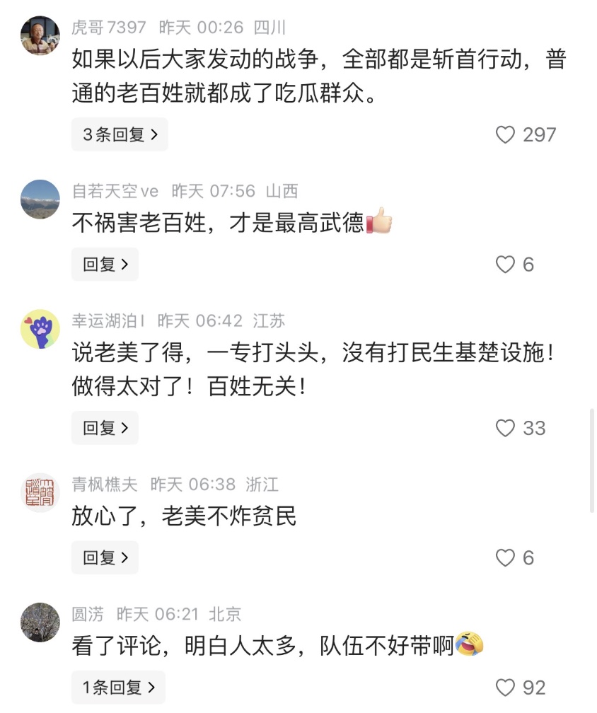 還有網友批評:「擒賊先擒王,這不是我們老祖宗的智慧嗎?」「人家是『擒賊先擒王』,怎麼就不講武德了?盡力避開百姓,直取敵方賊首,這就是從古至今最大的『武德』」「這些黨奴黨棍一肚子壞水,他們想看見的是美以傷害老百姓,然後他們就可以在道德制高點進行指責了」。