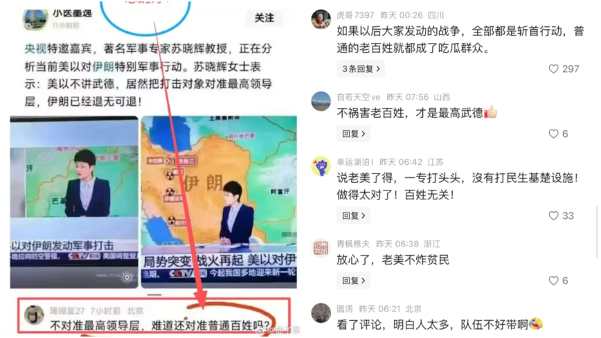 評論區隨後有網友跟進證實:「我同學上過央視,觀點與私下截然相反」、「節目上的話都是定好的劇本」、「錄了兩分鐘,最後只播出符合正面意義的12秒」。這場美以對伊朗的軍事打擊,不僅揭示了區域局勢的劇變,更讓中共專家的離譜評論淪為大眾茶餘飯後的笑柄。