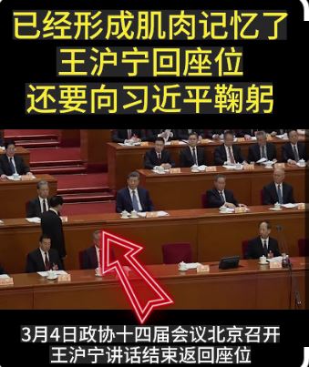 「望見就要鞠躬:王滬寧回座位還要向習近平鞠躬。」