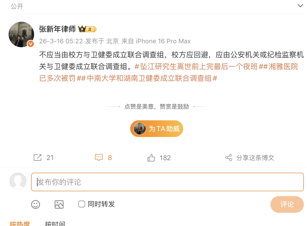 大陸知名律師張新年在微博發帖說,「不應當由校方與衛健委成立聯合調查組,校方應迴避,應由公安機關或紀檢監察機關與衛健委成立聯合調查組」。