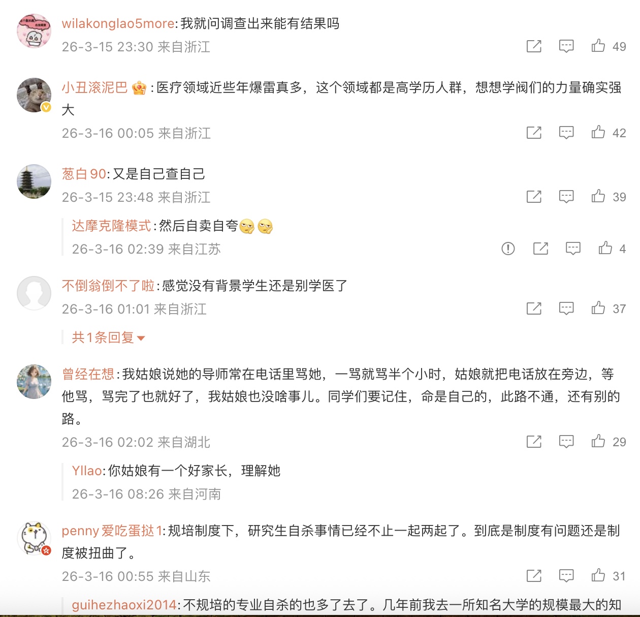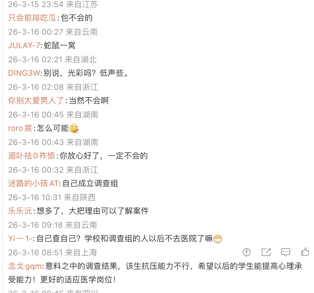 有網友介紹,「作為內行人,我只能說湘雅的輿情管控能力不行。我本科在北方的醫學院,碩士去了南方的醫學院讀研。這兩個階段里,幾乎每年都能聽說醫學生自殺的消息,只是大多都不了了之」「我之前也住過精神病院,我們那層樓住滿的話能住80多個患者,快過年時大多數輕症患者都出院了,留在精神病院過年的七八個,除了幾個在精神病院養老等死的老人之外,就是四個高材生,兩個哈工大碩士,一個港大博士,一個川大本科生」。