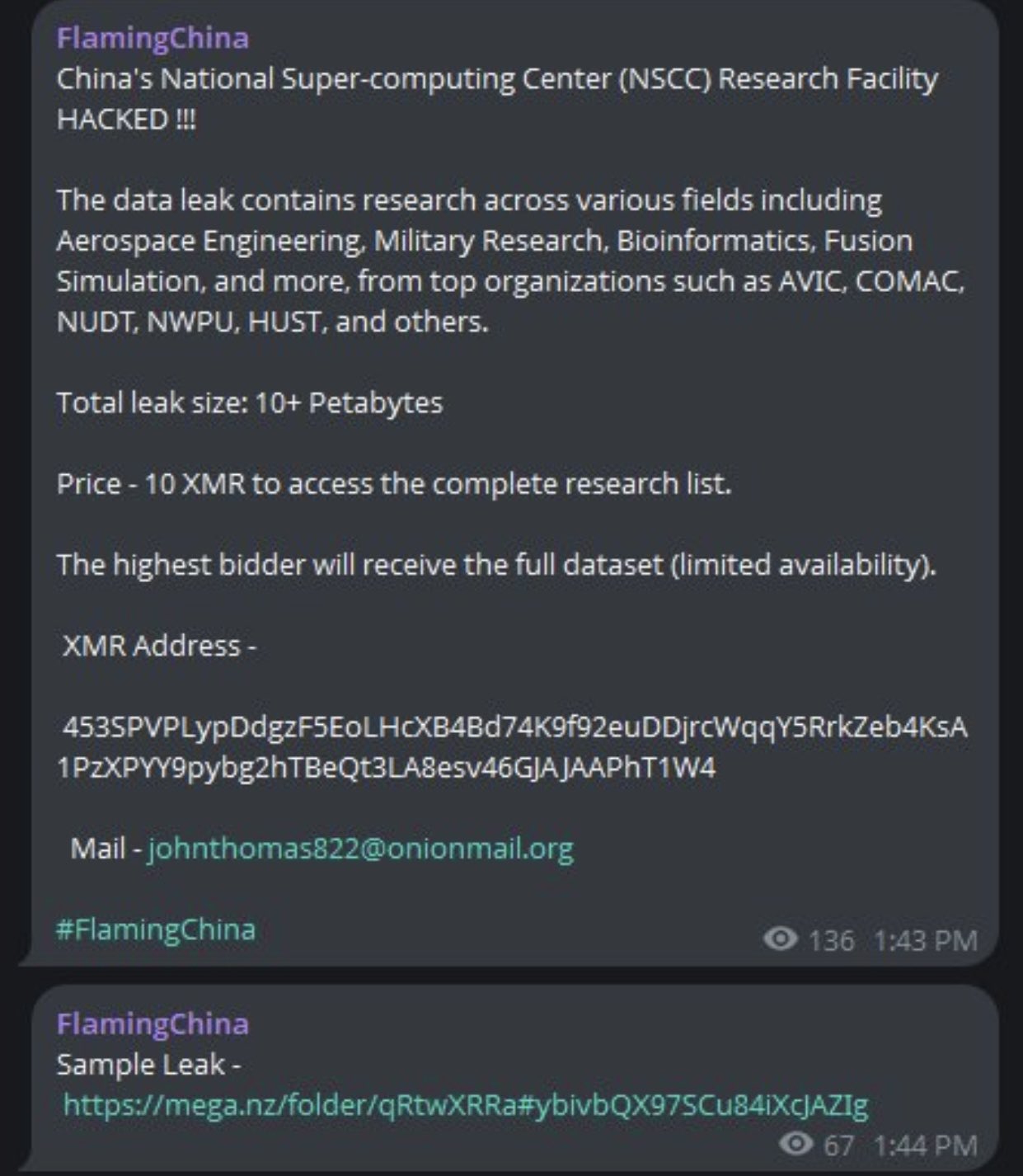 海外社交平台傳出的截圖顯示,署名「FlamingChina」在黑客論壇發帖,宣稱攻入了中共國家超級計算中心(NSCC)科研設施,下載了超過10PB(約1000萬GB)的海量數據,內容涉及航空航天、軍事、生物信息學、核聚變模擬等。