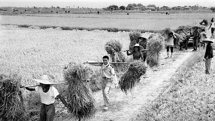 我們的勞動地點在16里外,天剛亮起床吃早飯後,大家就撿拾農具排隊往南走向目的地,黃昏再排隊扛着該扛的東西走回來。麥子、水稻、西紅柿、蘿蔔、白菜、大蔥,管種管收,來回每天32里地。老的有劉開渠、李樺、李苦禪、王曼碩、胡蠻、常任俠……都卷在隊伍里跟着唱:我們走在大路上,意氣風發鬥志昂揚……都70多了,高一腳低一腳蹣跚地、伸着脖子用心配合步伐,看着坑坑窪窪的路,這種哀哀欲絕的教育,真解程途之困。