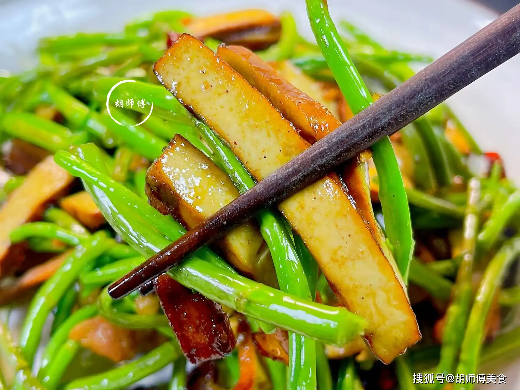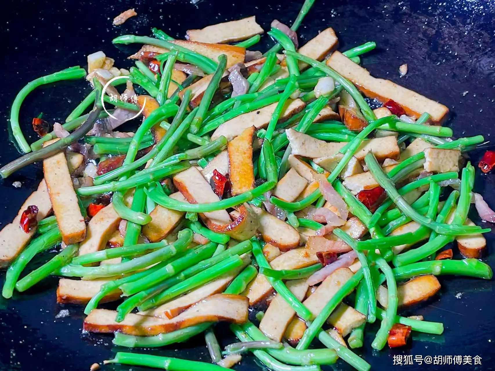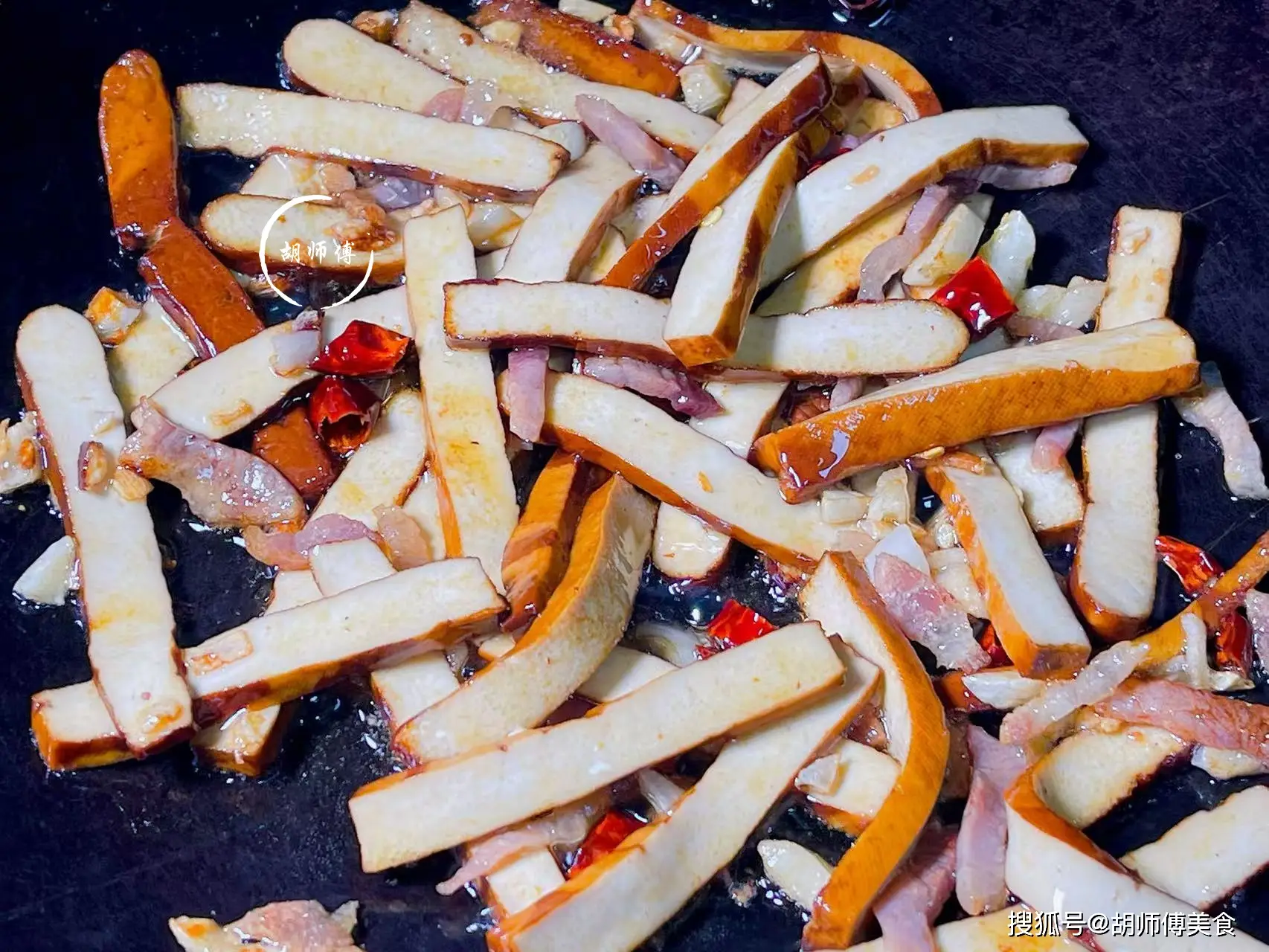 第四步:接着再把香乾放入鍋中,大火炒半分鐘後,撒上一點點生抽,繼續翻炒七八下,使香乾上色。