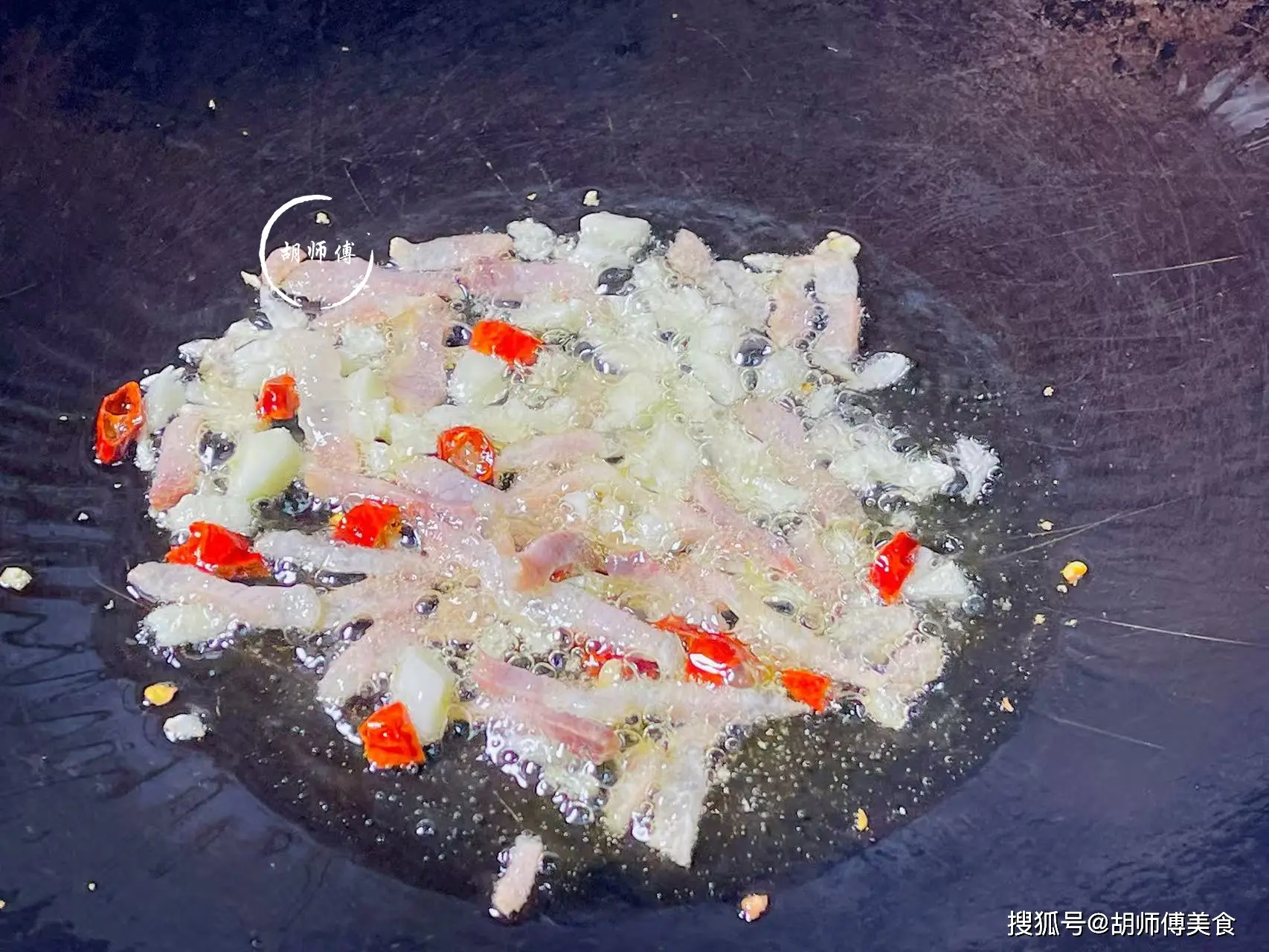 第三步:鍋中放入適量油,等油燒熱後,把臘肉放入鍋中炒香後,然後把干辣椒、蒜末、干辣椒放入鍋中爆香。