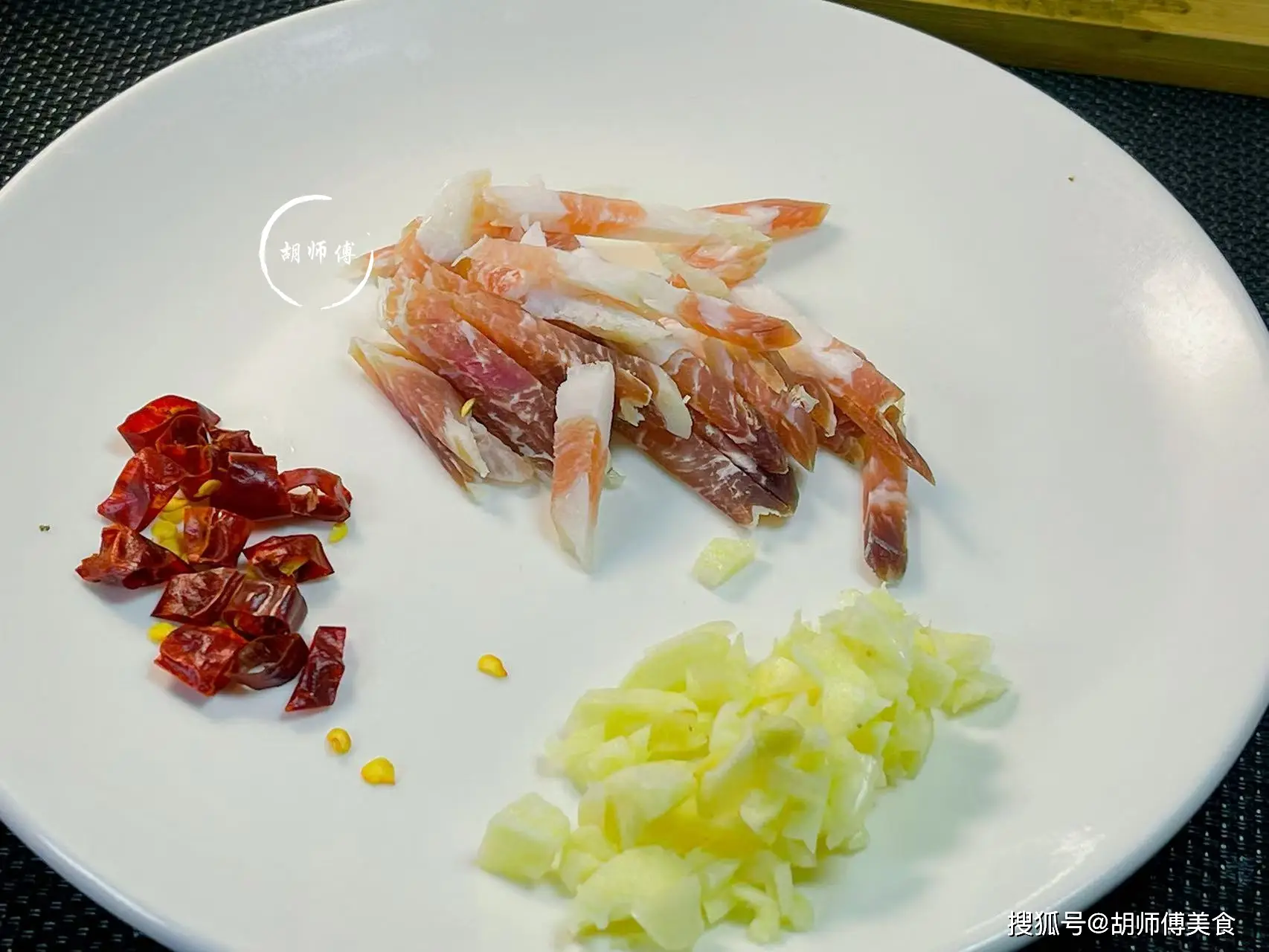 第二步:把臘肉沖洗乾淨,然後把臘肉切成細絲,接着再把干辣椒切成段,把大蒜籽切成碎末備用。