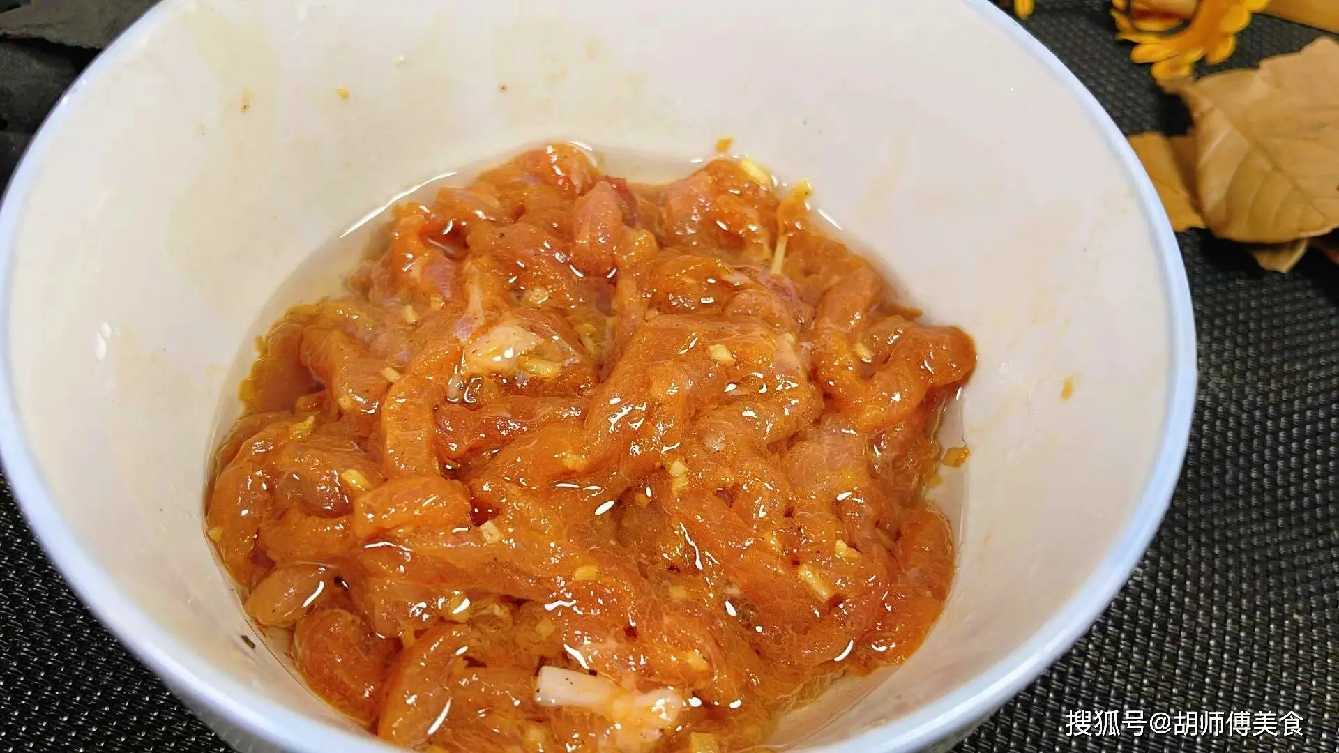 第二步:把瘦肉洗淨後切成細絲,然後將澱粉、生抽、食鹽、雞精、胡椒粉、一小勺水、5ml油放入肉絲中攪拌均勻。
