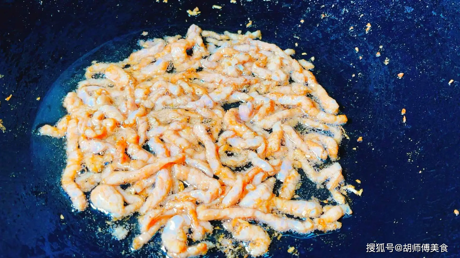 第三步:將鍋燒熱後,放入一勺油到鍋中,等油燒熱後,把肉絲放入鍋中,先不要炒,將肉絲煎10秒後再慢慢翻動,防止肉絲脫漿,然後大火將肉絲翻炒1分鐘後,把小米椒、蒜末、薑末放入鍋中爆香5秒。