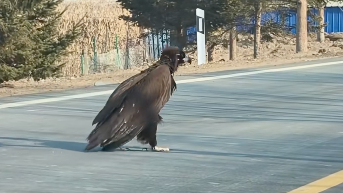 2026年3月21日,在吉林琿春國道上,有網友偶遇一隻巨型大雕過馬路,起初還以為是人扮的。(視頻截圖)