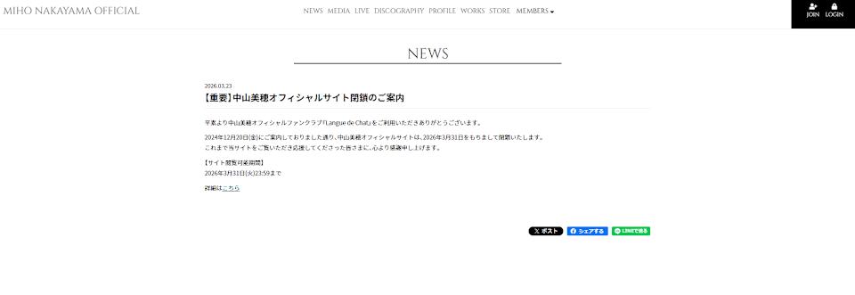 自中山美穗離世後,許多粉絲仍習慣透過官網回顧她的演藝作品、照片與過往訊息,成為重要的情感寄託。如今連網站也要宣佈關閉,對粉絲而言無疑再次帶來衝擊。