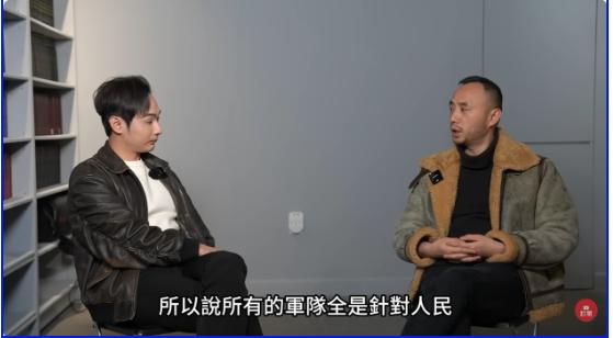 台灣網紅主持人「八炯」採訪一名中國的退役武警。(視頻截圖)