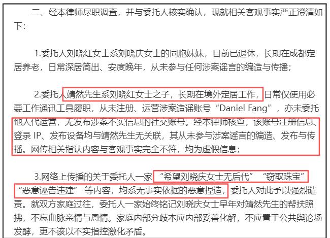 律師稱劉曉慶外甥雖長年在境外工作,從未註冊及運營涉案造謠賬號。而且,經過律師核實,相關造謠賬號註冊信息、IP及登錄設備均與劉曉慶外甥無關聯,而且網上相關的「希望劉曉慶女士無後代」、「竊取珠寶」、「誣告違建」等內容也都是惡意誹謗。