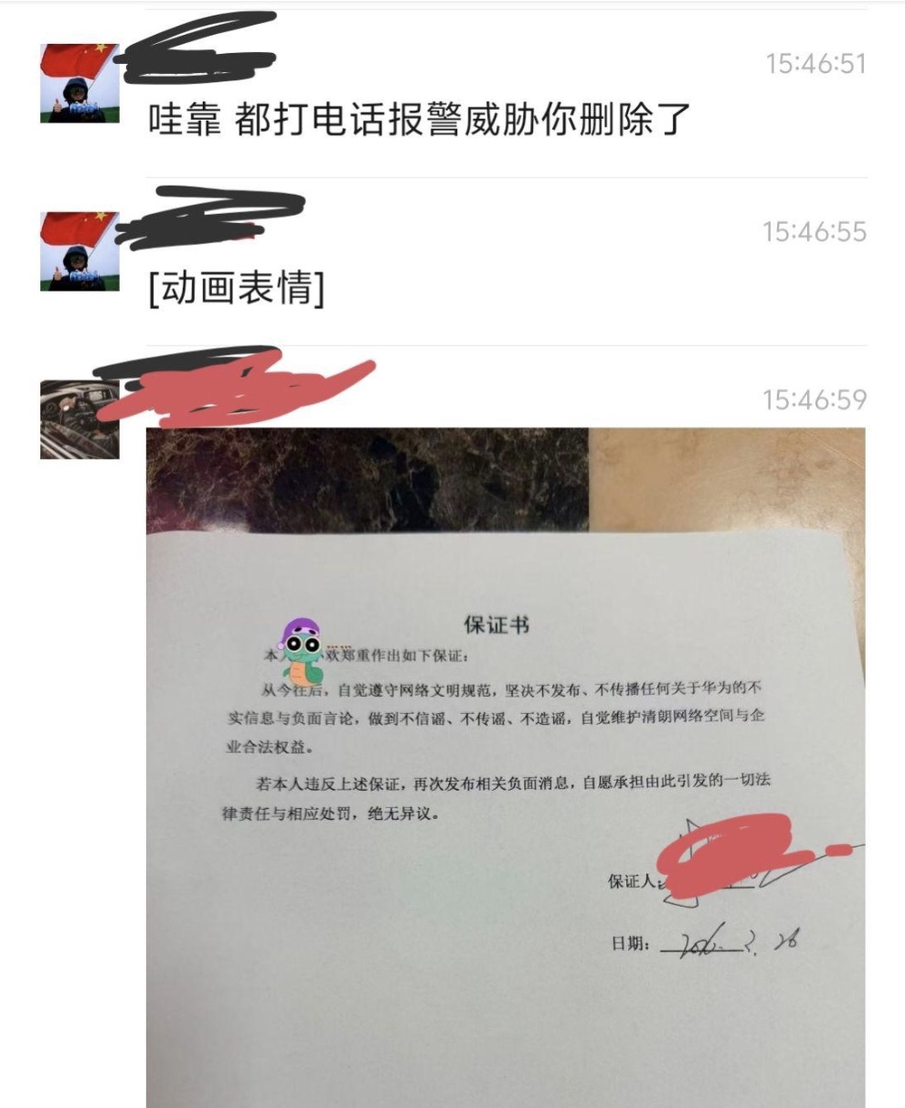 另有網友因為轉發關於此次撞擊事故的視頻而被華為報警,該網友被迫寫下「絕不轉發任何關於華為的負面消息」的保證書。