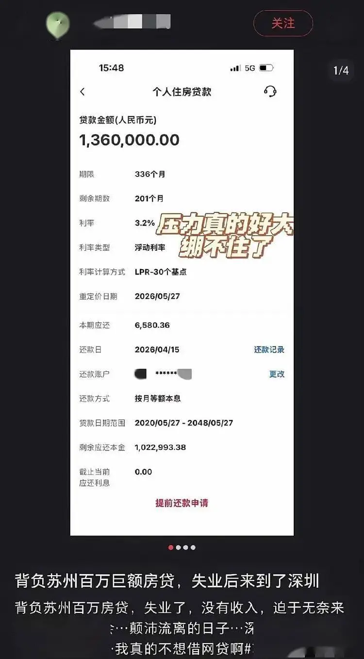 近日,一蘇州網友曬出了自己的房貸。據該網友接受,自己在蘇州買了房子,貸款了100多萬,結果失業了。不得不跑到深圳尋找生計,但是發現深圳物價好高,根本沒有那麼容易。