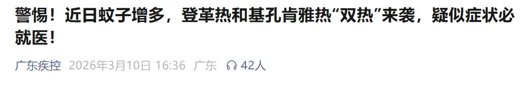「廣東疾控」此前也發文表示,蚊媒傳染病在全球部分地區和廣東周邊國家常年流行。假期跨境出行增多,前往東南亞、南美洲等登革熱、基孔肯雅熱高發地區的人員顯著增加。疊加2026年廣東遭遇暖冬,這就意味着由蚊子傳播的疾病——登革熱和基孔肯雅熱,極有可能提前進入活躍期!