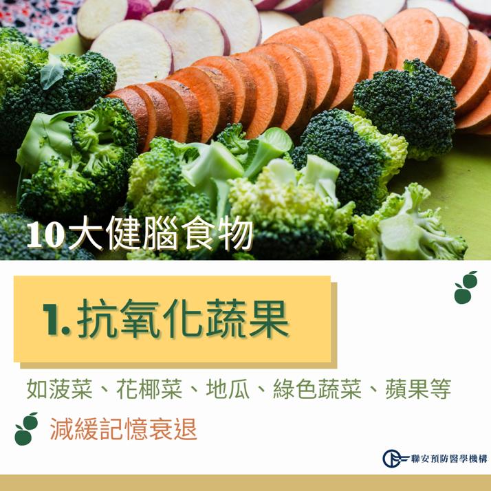 1.抗氧化蔬果:像是菠菜、花椰菜、深綠色蔬菜,或是地瓜、蘋果等食物可減緩記憶力衰退。