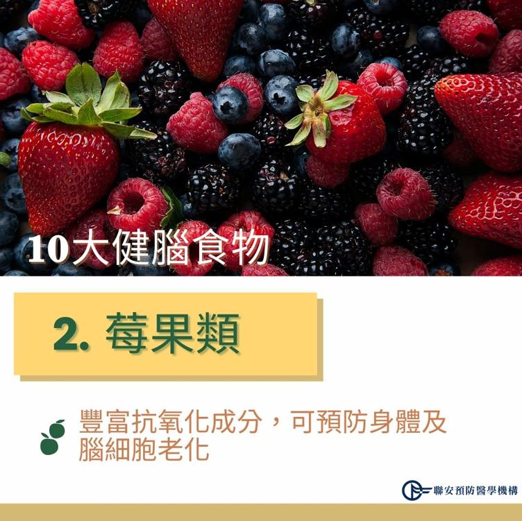 2.莓果類:藍莓、草莓、覆盆子等莓果類內含豐富抗氧化成分,可預防身體及腦細胞老化。