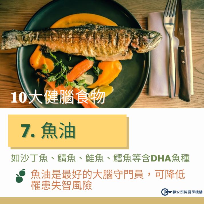 7.魚油:最好的大腦守門員!多攝取如:沙丁魚、鯖魚、鮭魚、鱈魚等魚類可降低失智風險。