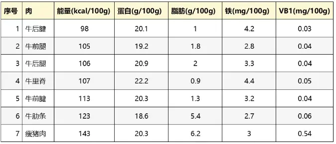 ➤熱量脂肪差可忽略:雖然比紅榜牛肉略高一丟丟,但《中國居民膳食指南》建議每天畜肉+禽肉吃40~75克。就算每天吃50克瘦豬肉,比能量最低的牛腱子多攝入22.5千卡(相當於1/4個蘋果),比脂肪最低的牛裏脊多攝入2.65克脂肪,這點差異可以忽略不計。