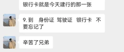 第二日上午,吳凱強到東陽市與對方面談。聊天截圖顯示,當天夜裏,「A風總監」告知他,「確定了」,明天9點到公司,並要求其帶上身份證、駕駛證、銀行卡。對方囑咐,「就是今天建行的那一張」。